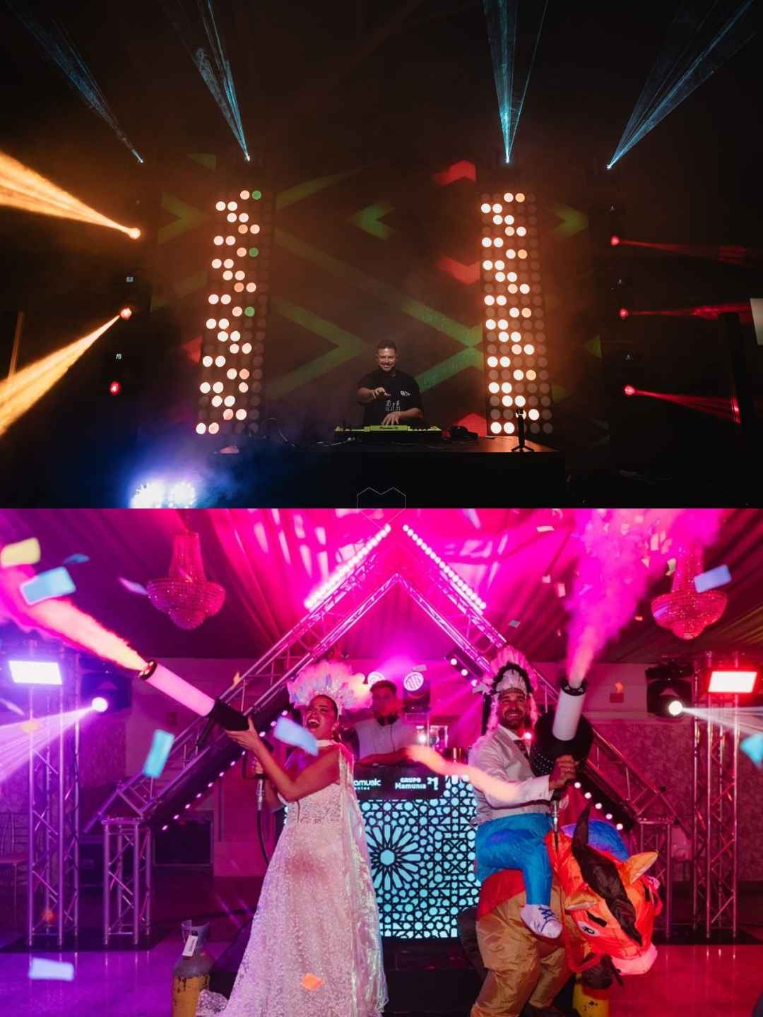 Show de Iluminación "Festival": Si buscáis impacto visual, nuestros montajes con estructuras truss, láseres profesionales y efectos de humo elevarán vuestra fiesta al siguiente nivel.